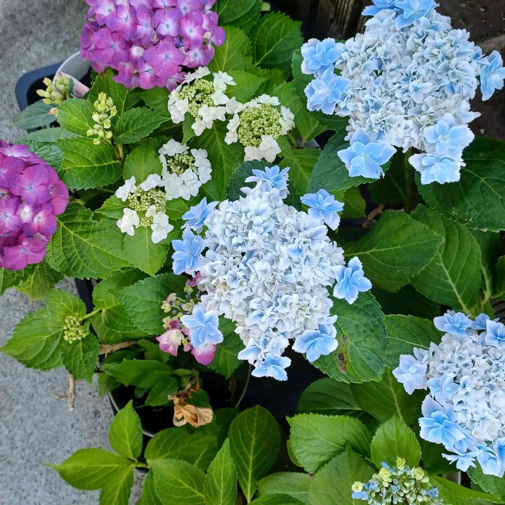 なぜか調子のイイ再利用鉢の紫陽花たち。贈答用の紫陽花が入っていた鉢にポット苗を植え付けた株。