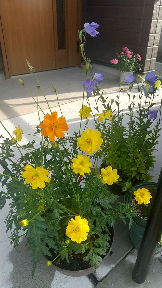 黄色いキバナコスモス、紫色のキキョウ、ピンクのカーネーションの花ありがとうございました。