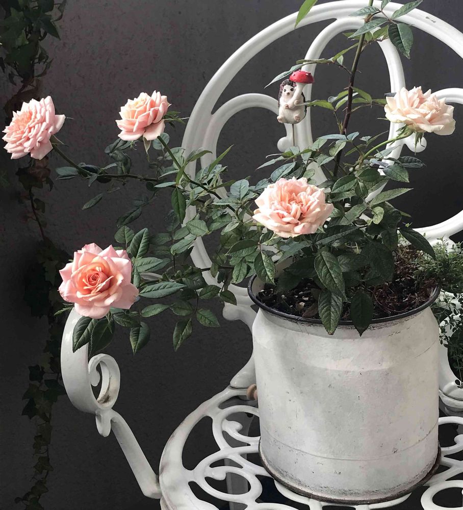 4月に咲いたピンクの後にオレンジ色のミニバラさん🧡が次々と咲きはじめました。ハリネズミさんが持っている🍄。可愛いですね💕ちょっぴり重そう。