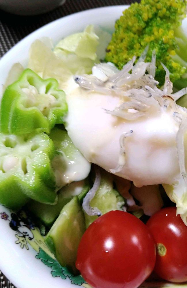 朝のサラダに乗せたオクラはダビデの星🔯。めちゃ可愛い😆👍。