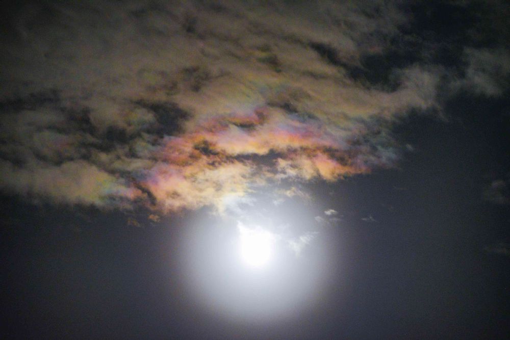 太陽の彩雲とは真逆で月の彩雲は暗すぎて見つけづらいですが、