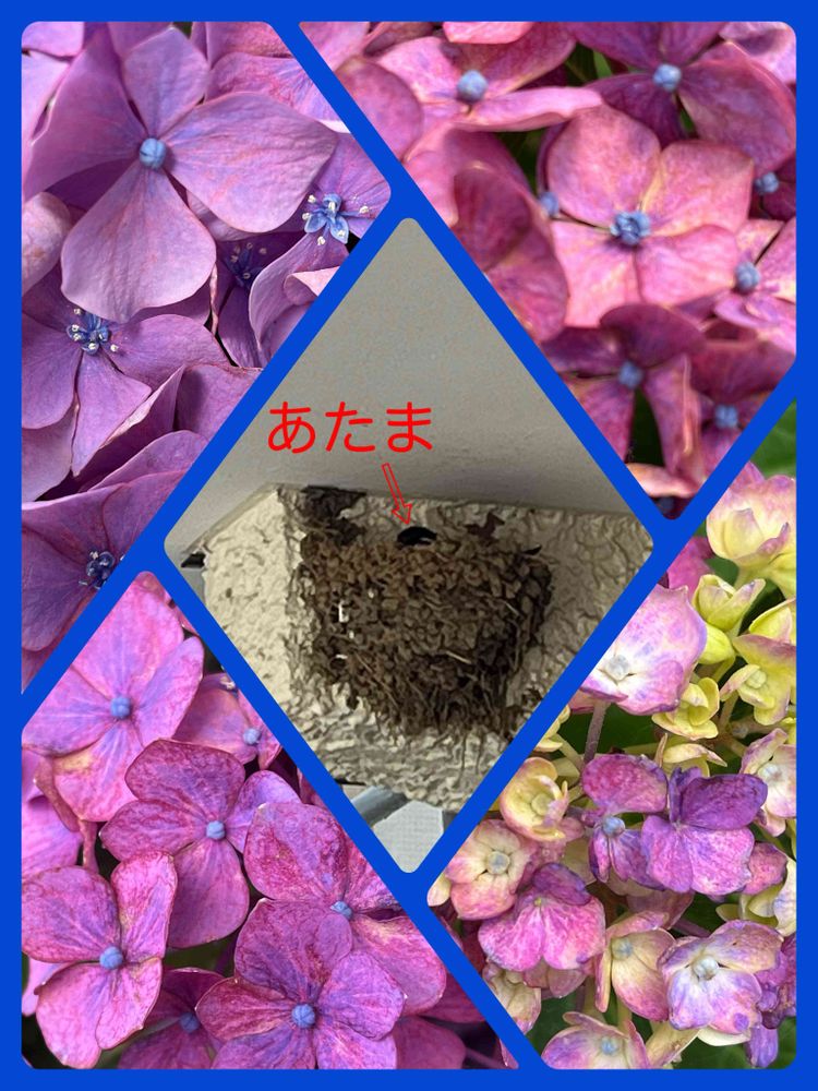おはようございます。薄曇り、23.9℃、9:30ちょうどいい。昨日梅雨入りしたようです。昨日の雨上がり、玄関先のツバメの巣、2度目の抱卵し始めました。紫陽花、いろんな色咲いてます。😻🥰😍☺️😸😋