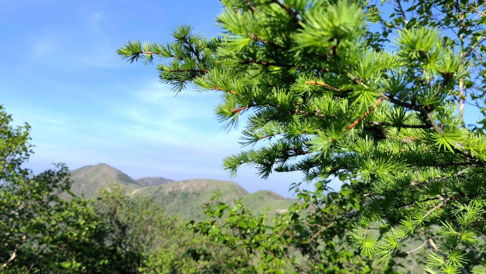 カラマツの葉も大きくなった。登りきったが、目的の錫ヶ岳はあの奥〜〜〜の薄っすらお山。