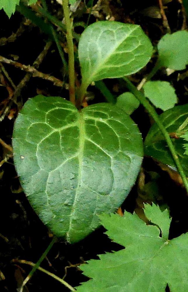 葉の脈に沿って白斑がありますが、よくあることで普通。葉が丸く、長さより幅が広い葉で、基部が深い心形で白斑がハッキリしてるのがあれば、それはジンヨウイチヤクソウ(腎葉一薬草)です。