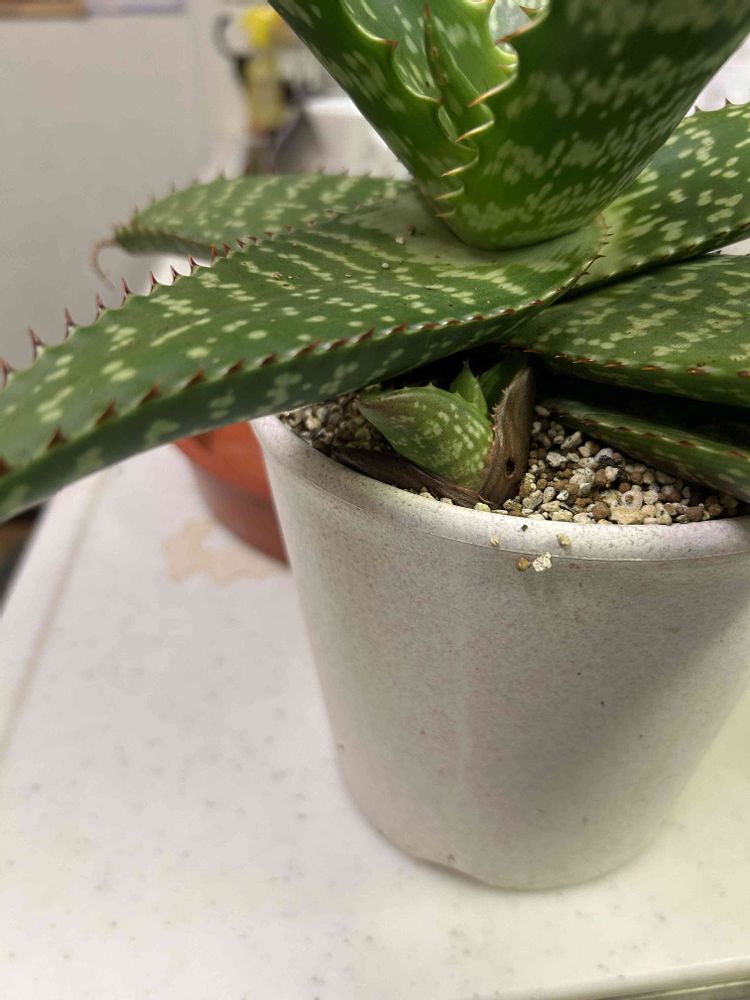 名前がよく分からないけど、アロエさんだと思うんですが子株も覗いていてキツキツだったので植替えしました。アガベの様な棘あり😅