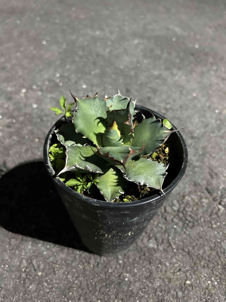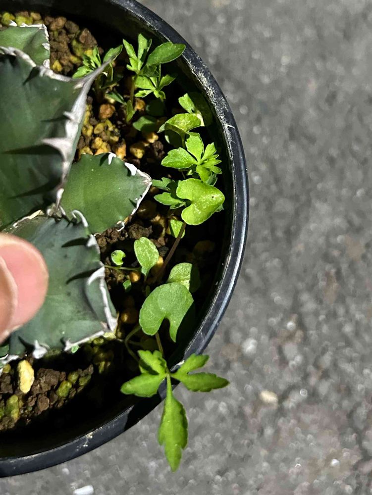 アガベの姫厳龍さんの様子を見たら、近くにいるウスベニヒゴさんの種がとんでいました!
