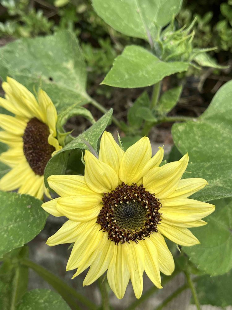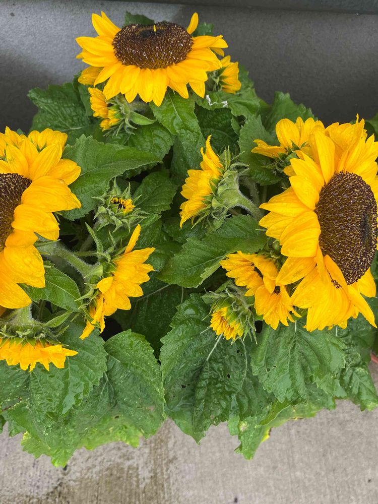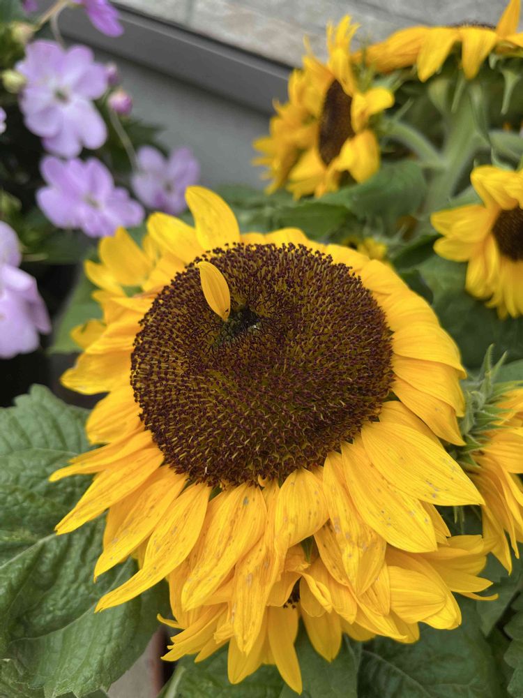 背は低く、一つだけ大きなひまわりの花の周りに何個もちょっと小さめなひまわりの花がが沢山あります🌻1つの鉢に3個のひまわり