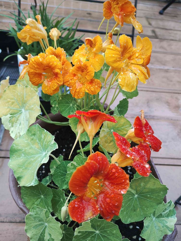 種から育てたナスタチウム、お花が豪快すぎて斑入りの葉っぱが霞んでしまってます😆
