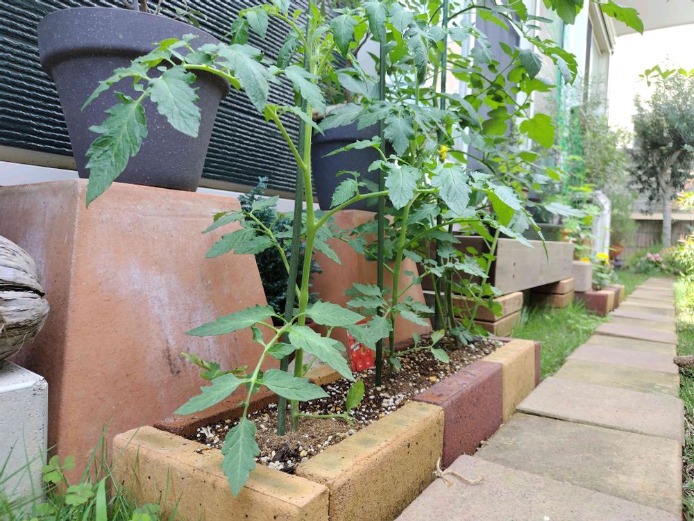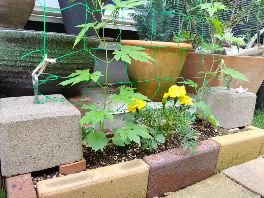 そんなミニミニサイズのポタジェに欲張って、1つにはトマト1鉢とミニトマト2鉢を無理やり植え、もう1つにはゴーヤ2株とコンパニオンプランツとして相性のいいマリーゴールを1鉢植えました🍅
