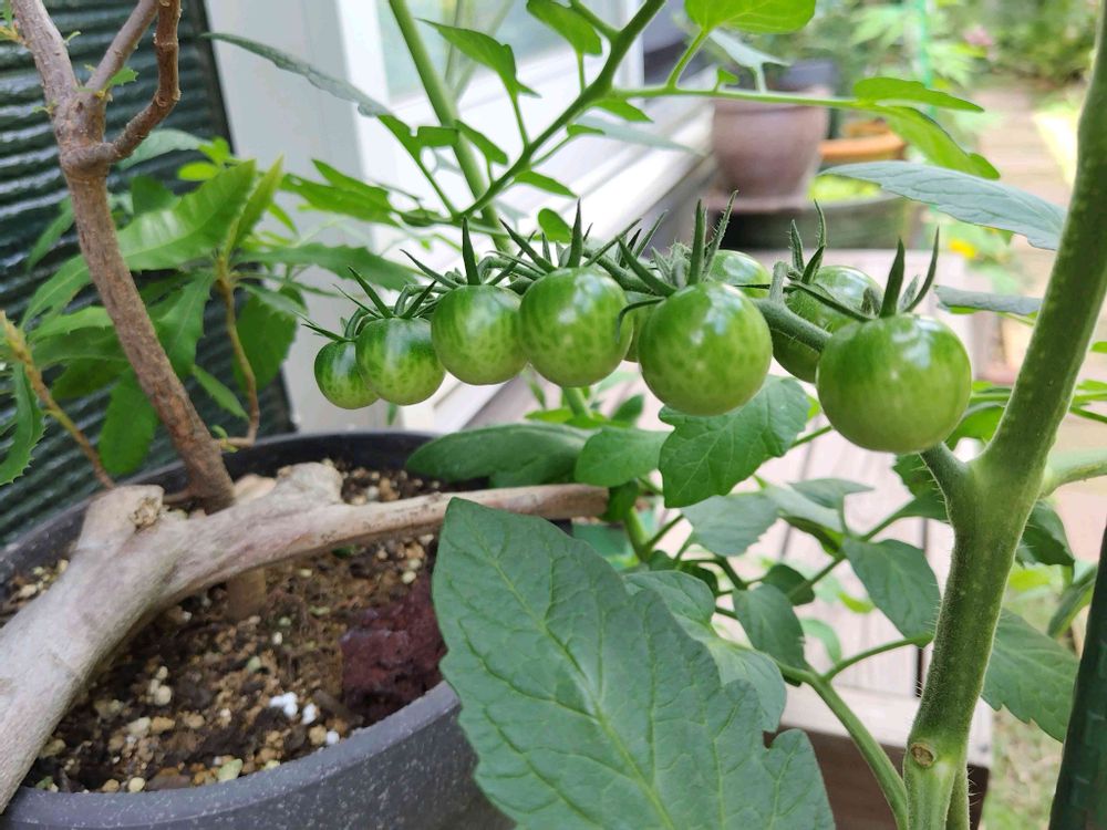 ミニミニポタジェ製作から約3週間、最初に植えたミニトマトは既にたくさんの実を付け始めました♪