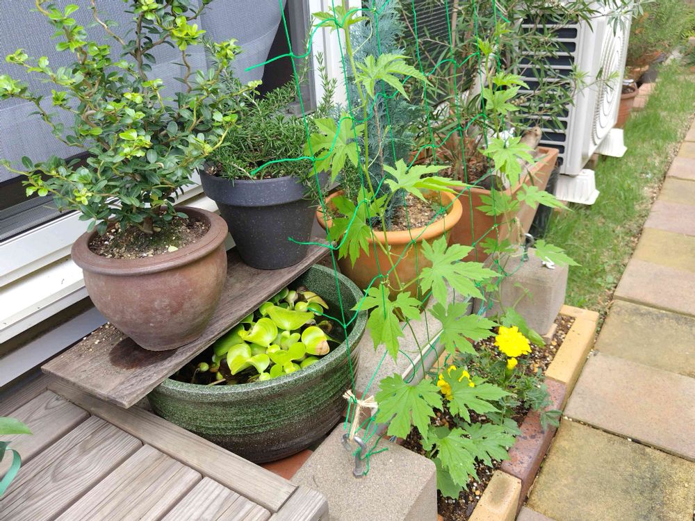 ゴーヤの方はその内側にメダカを入れた睡蓮鉢を置いて、これからゴーヤの葉が茂ると睡蓮鉢の水温上昇を防いでくれるようにしてみました😉