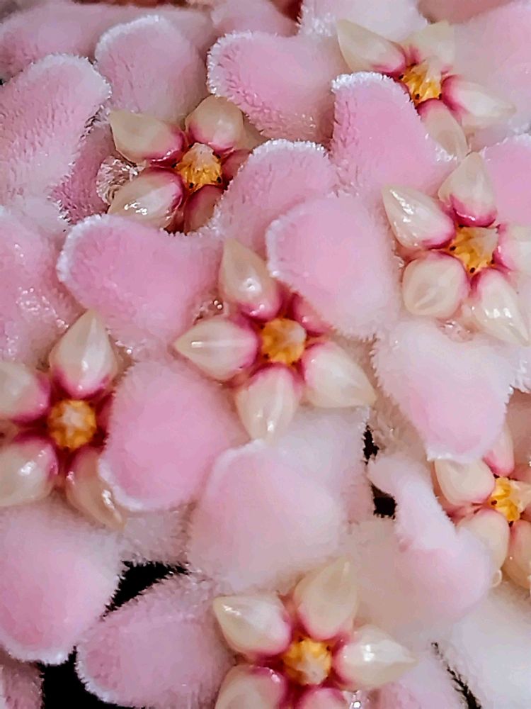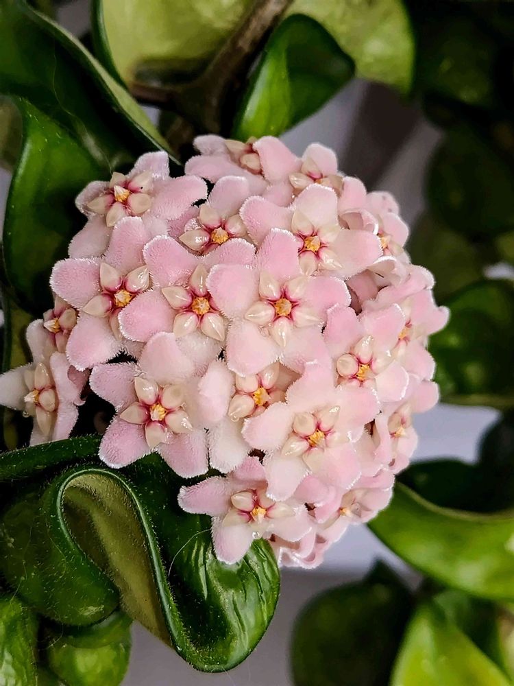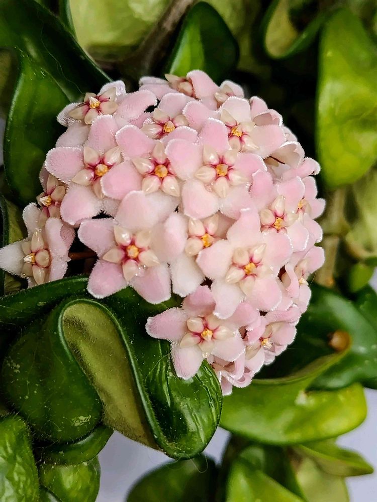 くりんくりんな葉っぱちゃんに押し上げられ 上向きに咲いてくれた ホヤ・カルノーサコンパクタさんのお花さん🩷🤍❤️💚