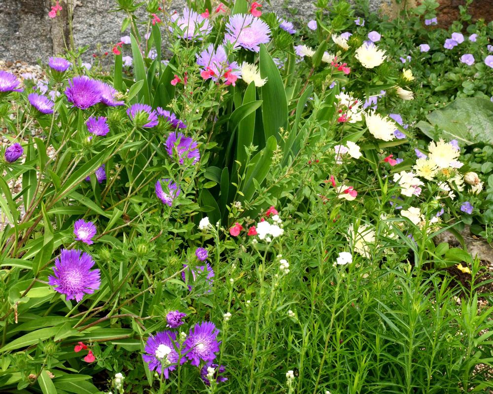 ストケシア3色と、アキレア、チェリーセージなどの宿根草が花壇に咲いています😊