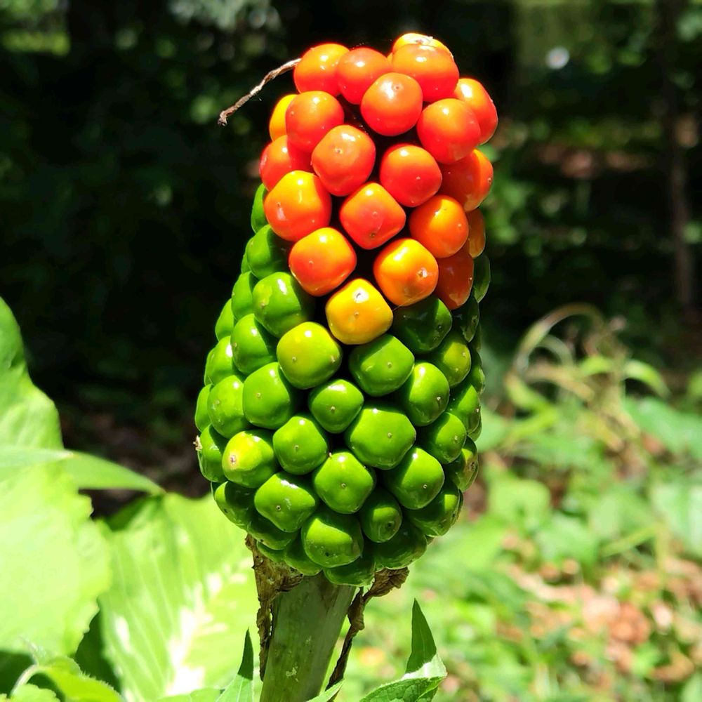 テカテカしたオレンジ色と緑色の粒粒がちょっと不気味のミミガタテンナンショウ(耳型天南星)です🌱