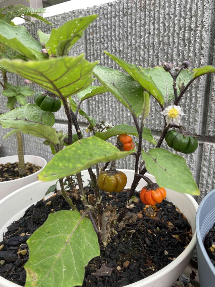 去年の秋に買って、どうにか冬越しできたソラナムパンプキン。