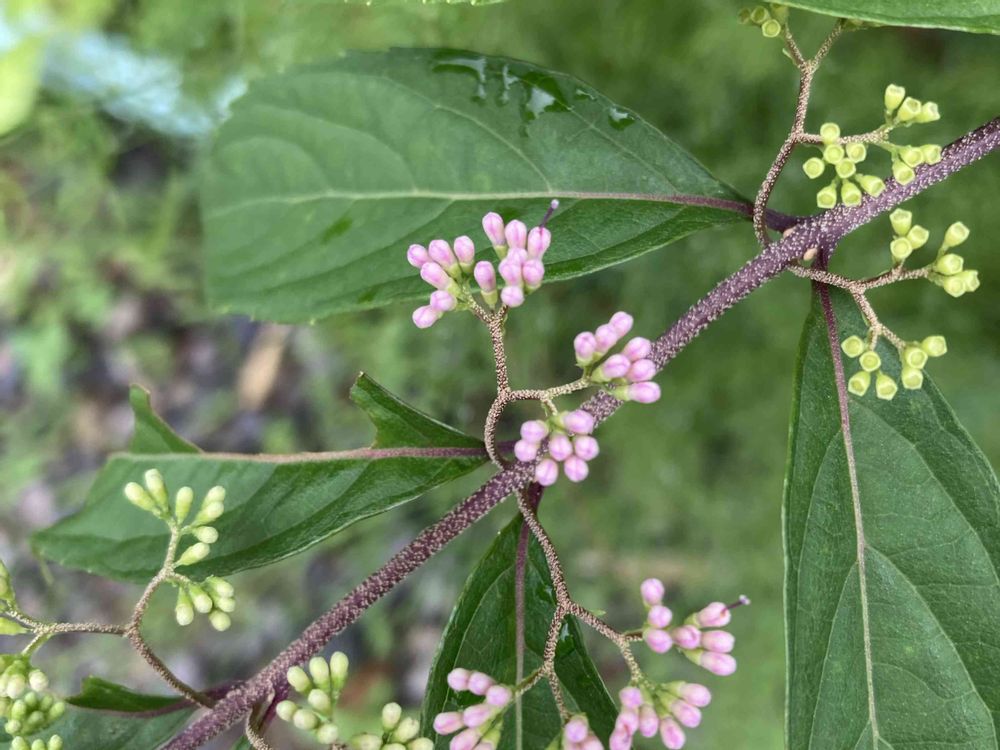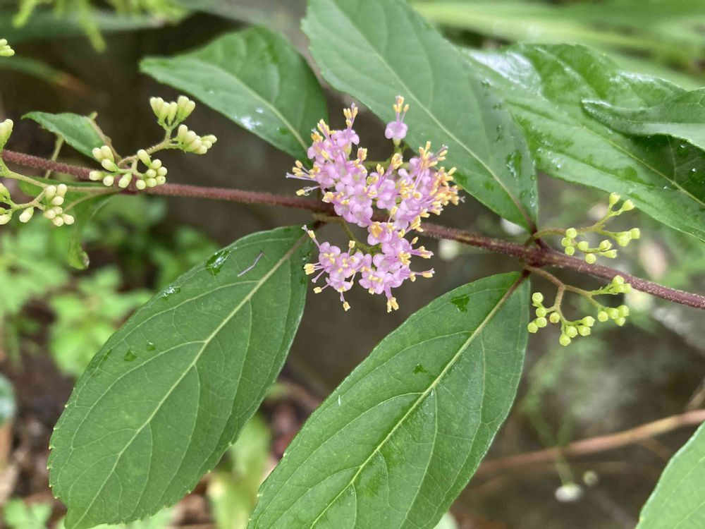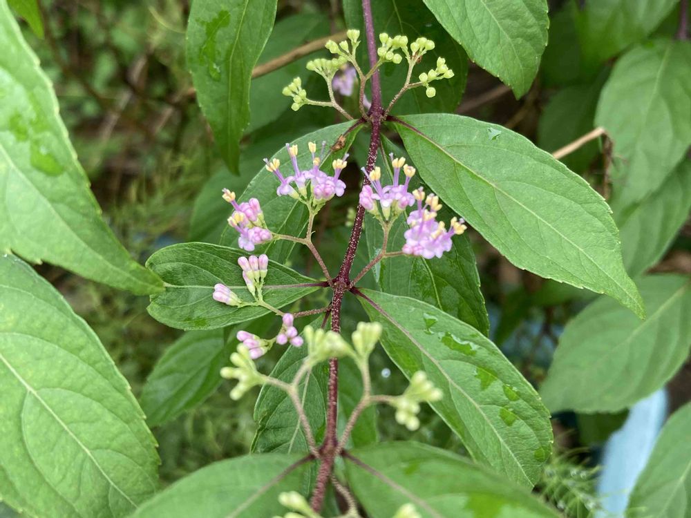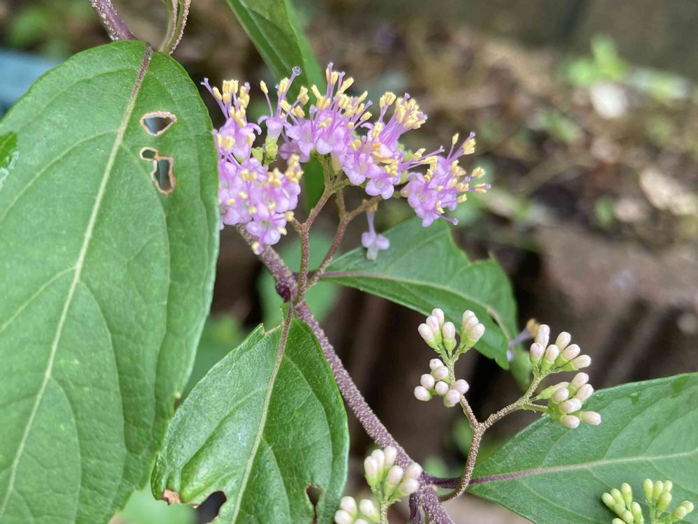 秋になると濃い紫色の実をつけるのが楽しみな花。実が溢れて、株の周りに種が落ちて、たくさんの発芽が見られます。苗が増えて、小さな庭のあちこちにコムラサキが広がっています。