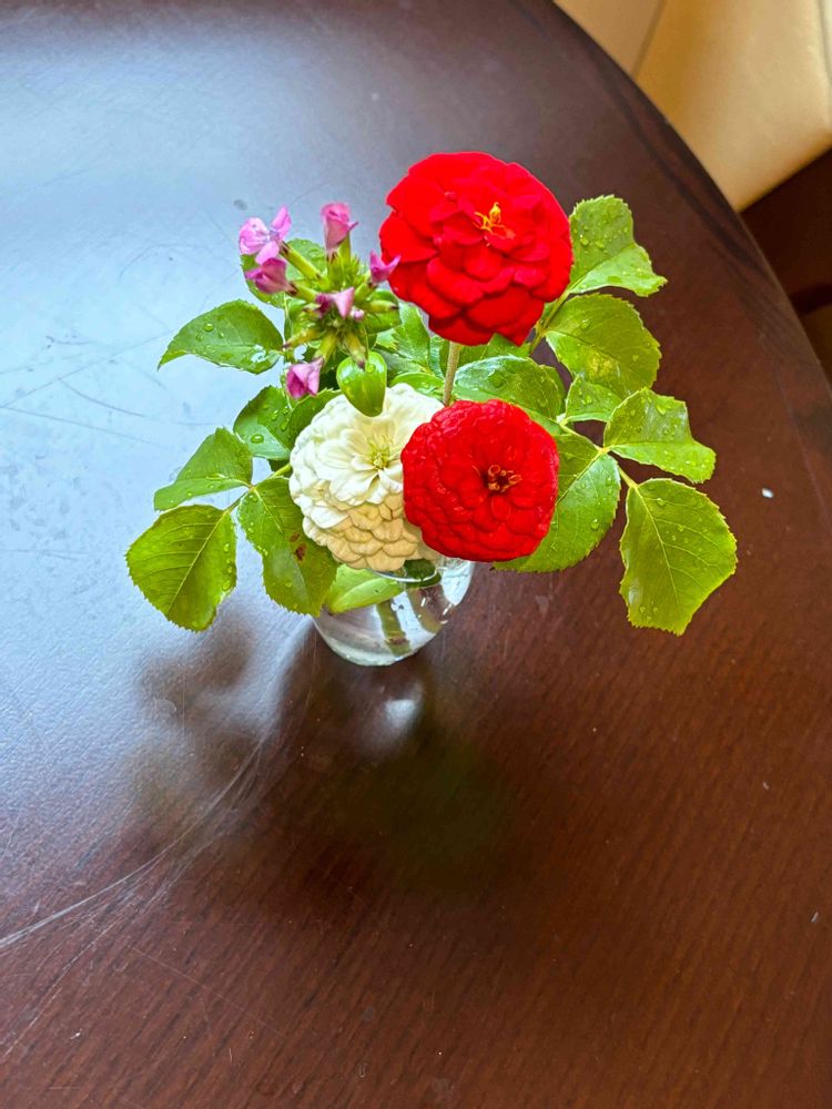 見切りコーナーからお迎えして施設のベランダに植えた。50円の百日草が紅白咲いたので、小瓶に飾ってみました。