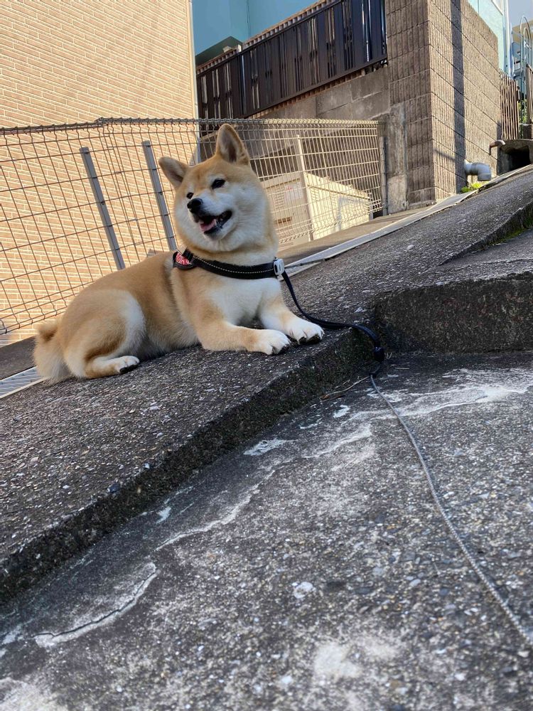 散歩途中に休憩です😊これ真っ直ぐ撮ってます📸激坂の途中なんです。登り切ってからの方が絶対ゆっくり出来るのに…休憩の仕方がクセ強めです😅