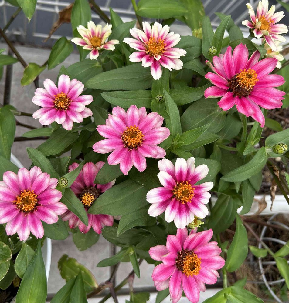 こぼれ種のジニア・プロフュージョン、お花がたくさん咲いています。