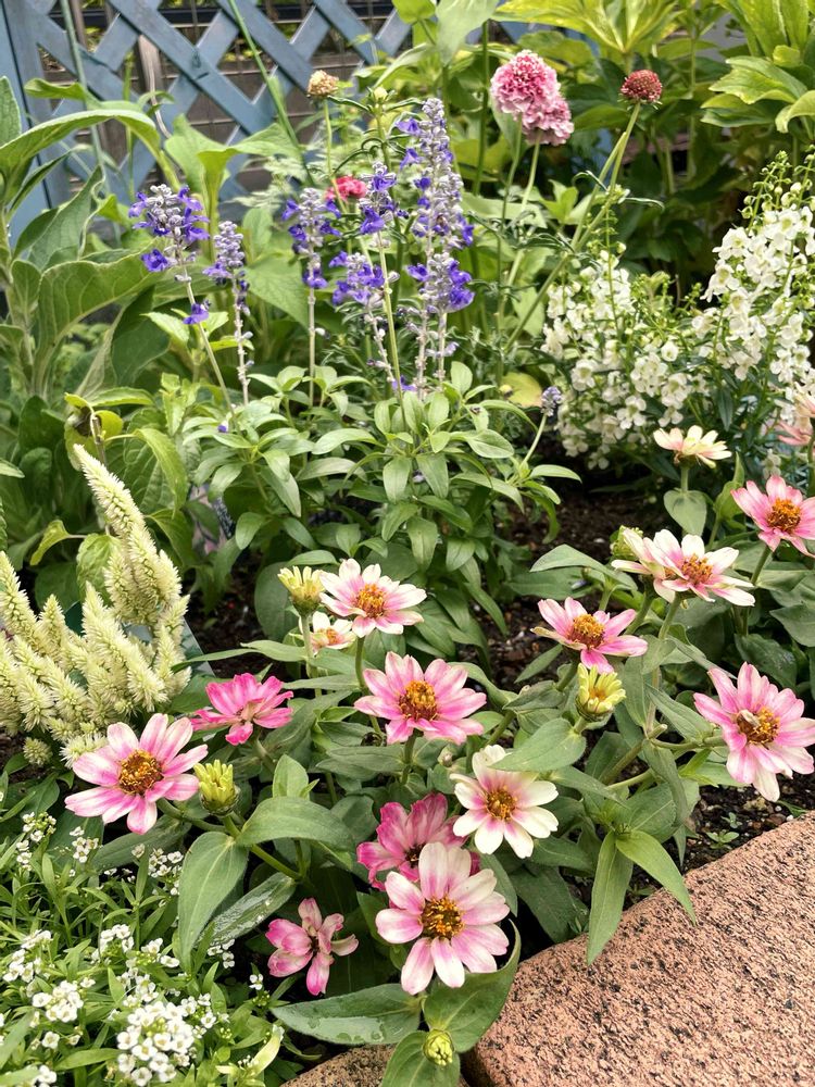 ①東の花壇を夏バージョンにようやく植え替えました💓ジニアプロフュージョン、サルビア、アンゲロニア、スカビオサスクープ。賑やかになりました🌸