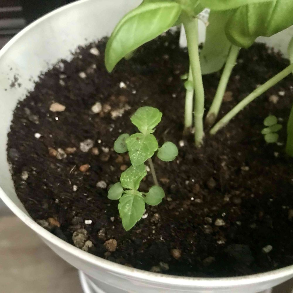 毎年植えてはどこかに種子がこぼれ落ち、どこかの鉢から芽が出てくる。今年はバジルの根本(pic3. 20240423)から生えた。土を再生させたところから発芽したらしい。