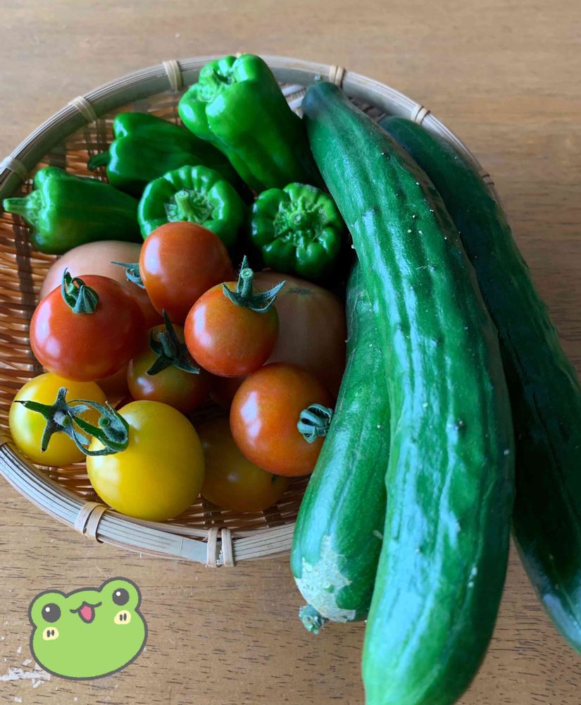 今朝収穫した野菜たち、雨が降ったのできゅうりが一気に大きくなっていました〜嬉しい収穫です🤗