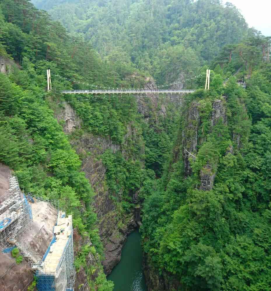 凝灰岩が浸食され生まれた峡谷で、深度100mにも及ぶ切り立った岸壁が約2kmにわたり広がっています。峡谷内にある川俣ダム正面の岸壁に架けられた観光吊橋「渡らっしゃい吊橋」からの眺望は絶景で、断崖を真近の感じることができます。