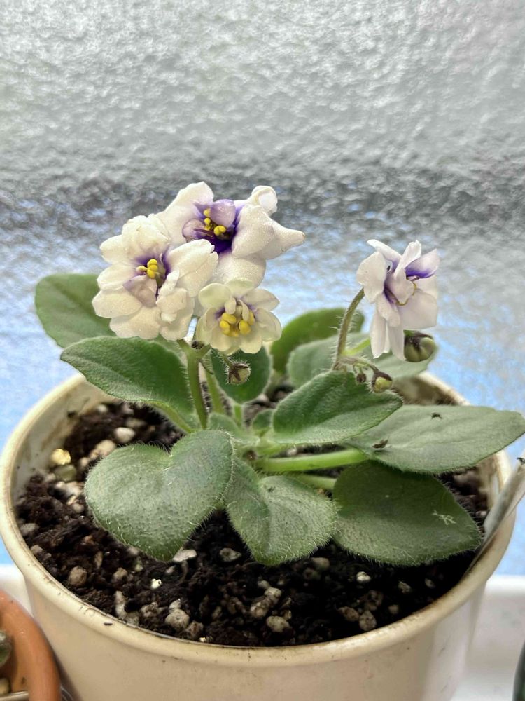 可愛らしいミニセントポーリア💕白の中心に紫色て、爽やかな色味です。以前お迎えしたオグリさんのミニセントポーリアは、タグに名前が書いてあったのに、これはなくて残念。