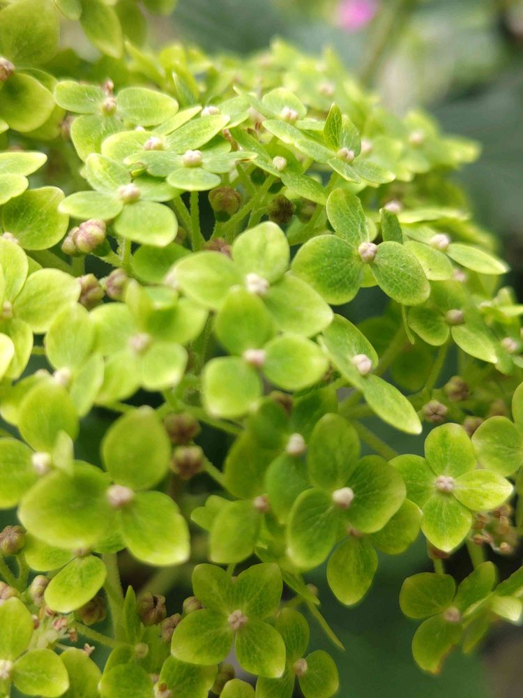 ライムグリーンの装飾花に小さなピンクの小花💚🩷