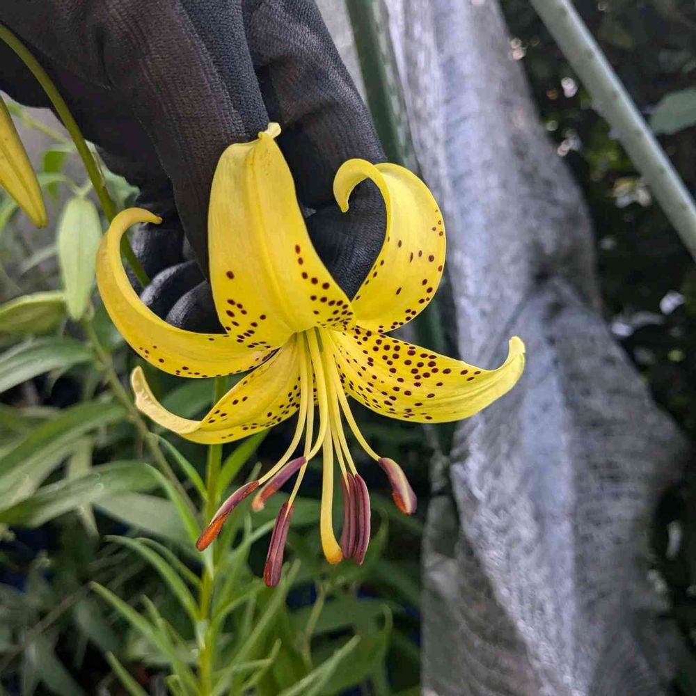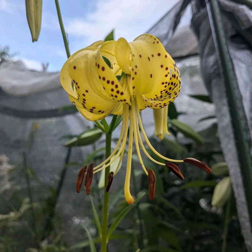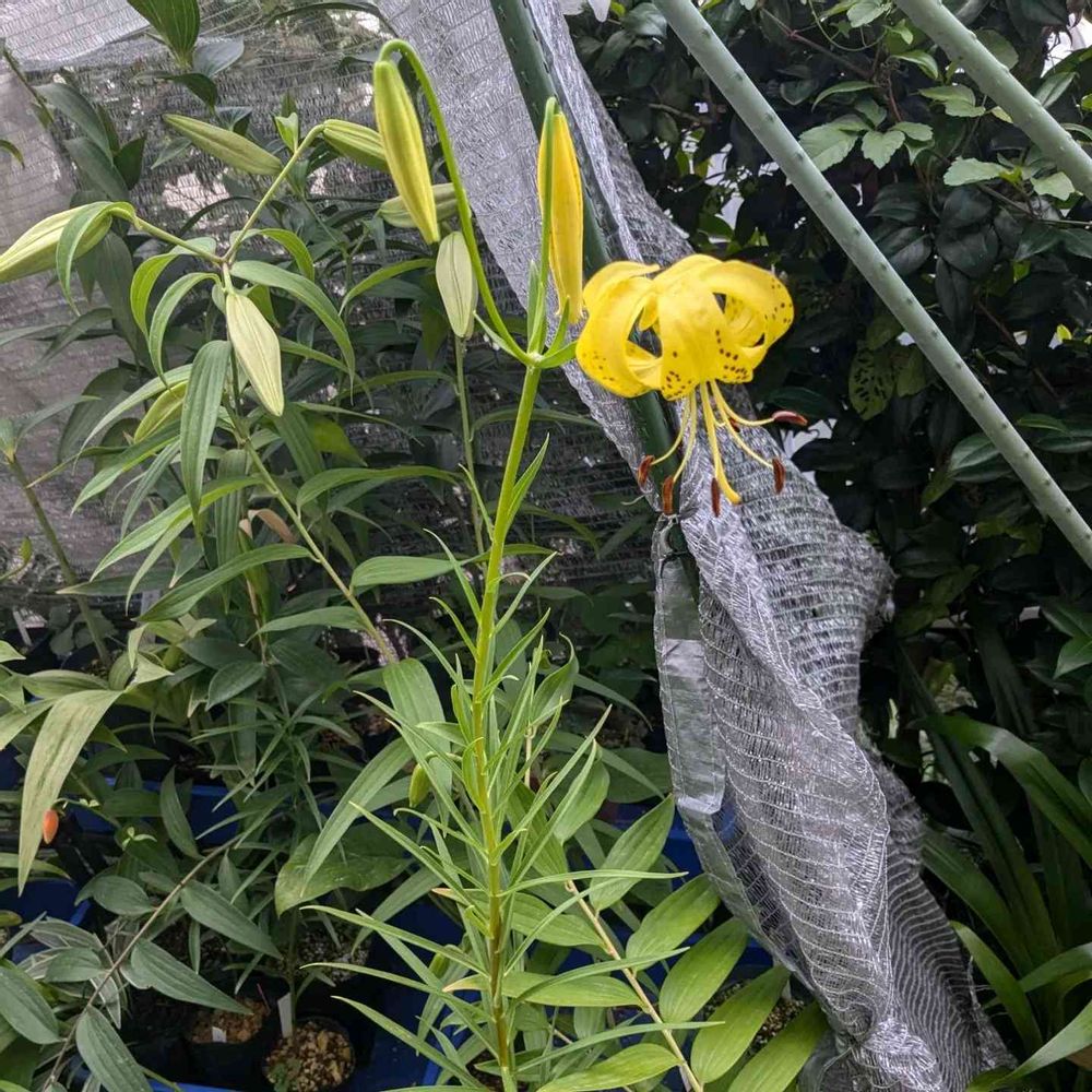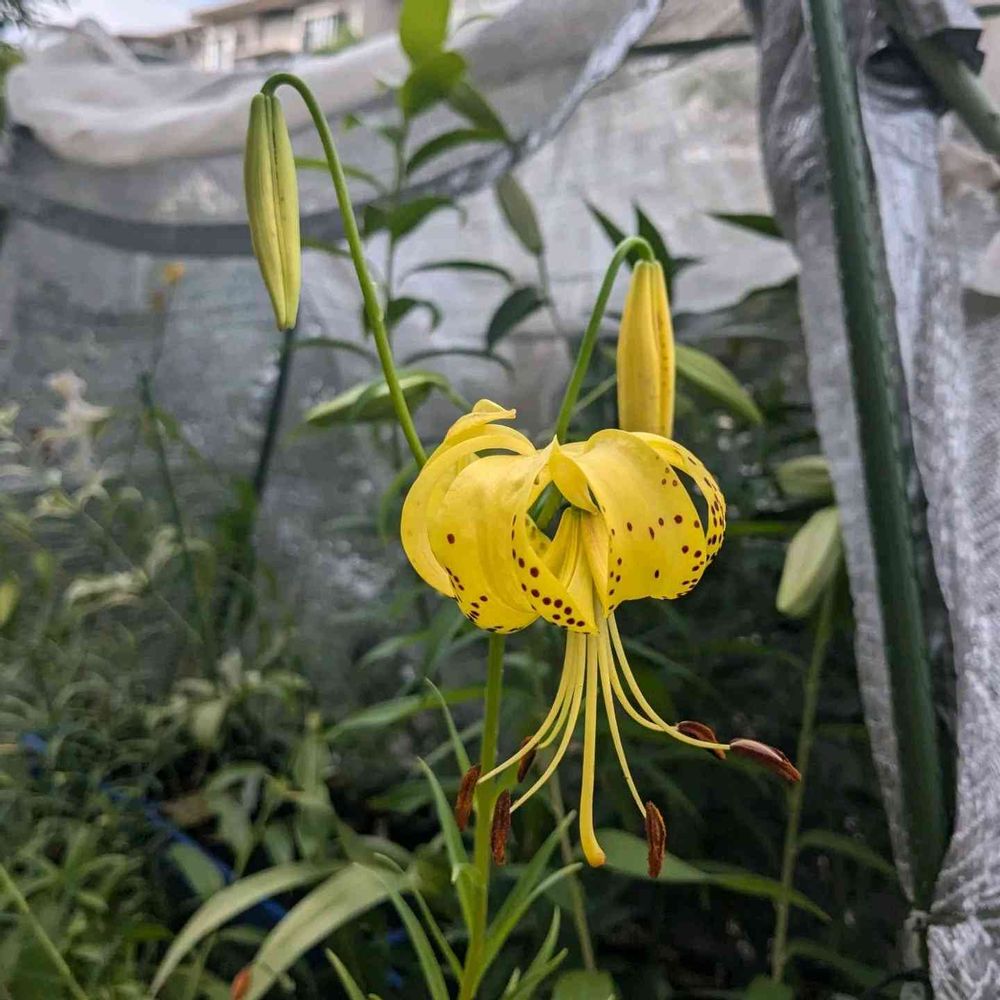 オウゴンオニユリに似ていますが、ムカゴが出来ないです。オウゴンオニユリよりもサイズは小さく、茎も細いですね。病気にも弱いので一時期は絶滅一歩手前までいったこともあります😅