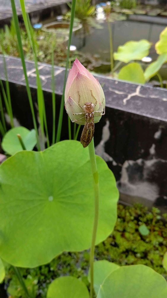 蓮の蕾にヤゴの抜け殻がついてました