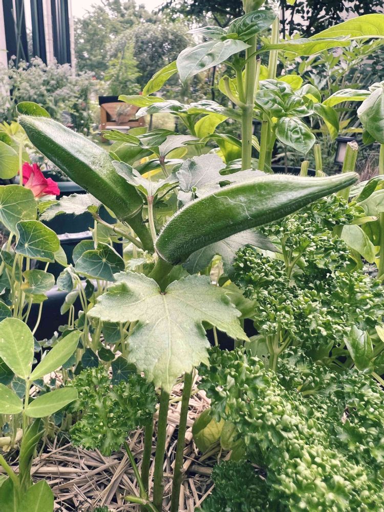 オクラが育ってきました。写真では大きく見えますが、実物は5センチ弱でまだ小さいです。