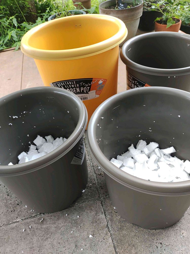 かなり大きいポットに見えて、かさ増しの発泡スチロールを敷き詰めて準備中です。