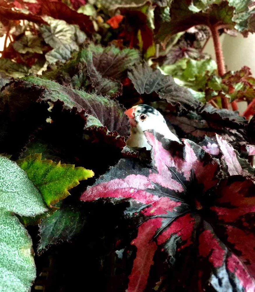 [@id:13409] さん まだ生きてますよ😂 おじいちゃんのくせに めっちゃつついてきます🐤 鳥とランとベゴニアと暗めの観葉が同じ部屋で、鳥小屋掃除の時は放すのですが ベゴニアに突っ込んで行きましたね…🐣