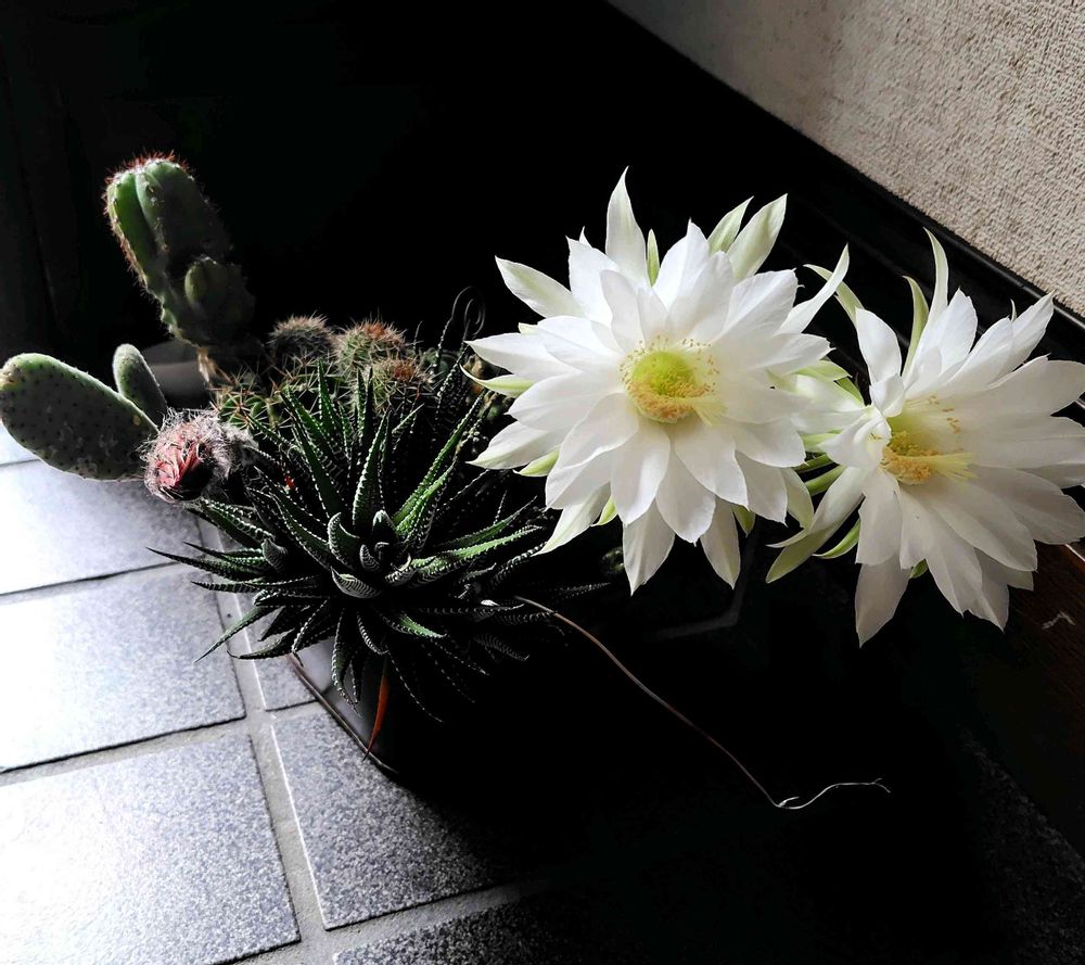さん、空家になった実家から引き上げてきたサボテン外は咲いたんです、ダイ◯―育ちは私の愛が足りないようです