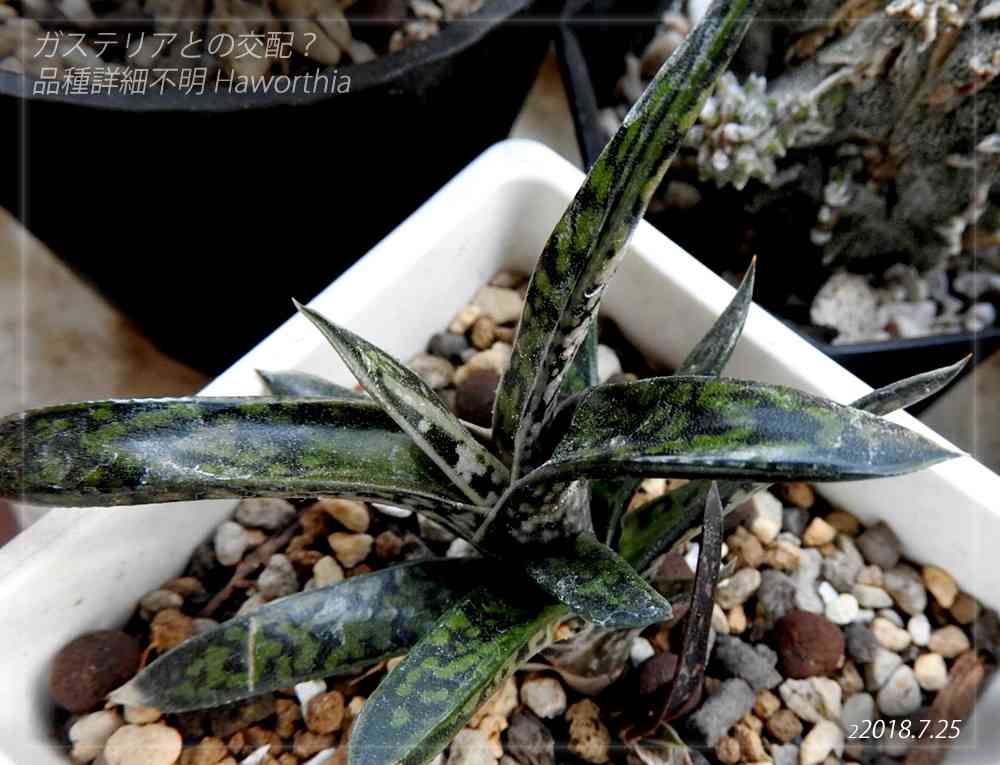 ヤフオクで入手。出品者も「ガステリアとの交配種? 品種詳細不明 ハオルチア」としていたように正体不明。ハオルチアの棚にいたのかもしれないけれど、この葉っぱの模様はガステリアっぽい。この葉っぱの模様が気に入ったのと、ガステオルチア(ガステリア×ハオルチア)だったらいいなーという期待を込めて。