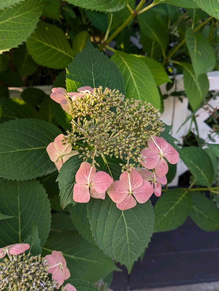 ガクアジサイ系も白の花に縁取りがピンク色のと全体が薄い紫色っぽい青色の二種類が咲くようです。