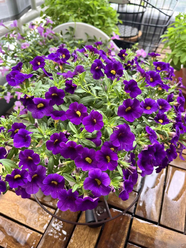 梅雨空で、どんより曇り空です☁️ PWスーパーベルポケット・ブルー✨ 5号鉢で、コンパクトに育てています😆🎶 この間、ベランダに雨が降り込み☔ずぶ濡れになったけど、見事に復活して😃よく育っています🎵この深みがある色☺️癒されます🥰