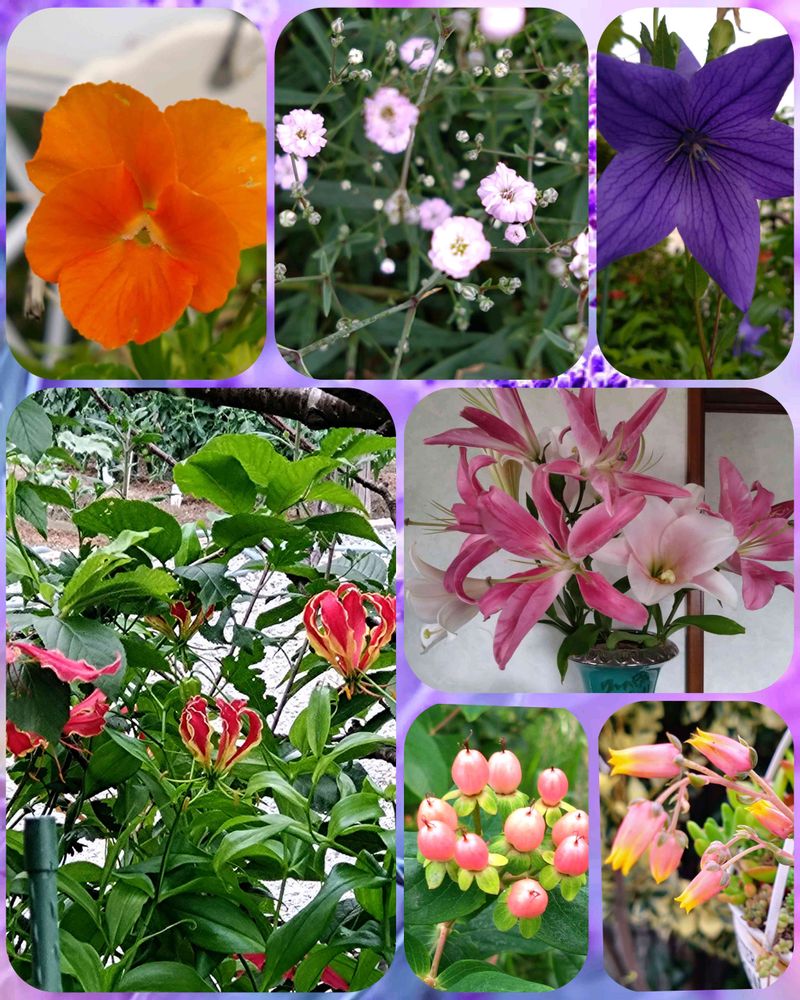 お花は左上から時計回りに↖→ビオラ、ビンクのカスミソウ、キキョウ、カットしたオリエンタルユリとテッポウユリ、多肉さんのお花、ヒペリカム、グロリオサです、ビオラと、カスミソウは、切り戻したら又咲いてきました、ユリは玄関に〜、サクランボの木の下は、グロリオサが埋め尽くすように広がっています、球根を少し掘りたくても、🍒の細かな根が一杯に広がっていて、手がつけられません💦💦