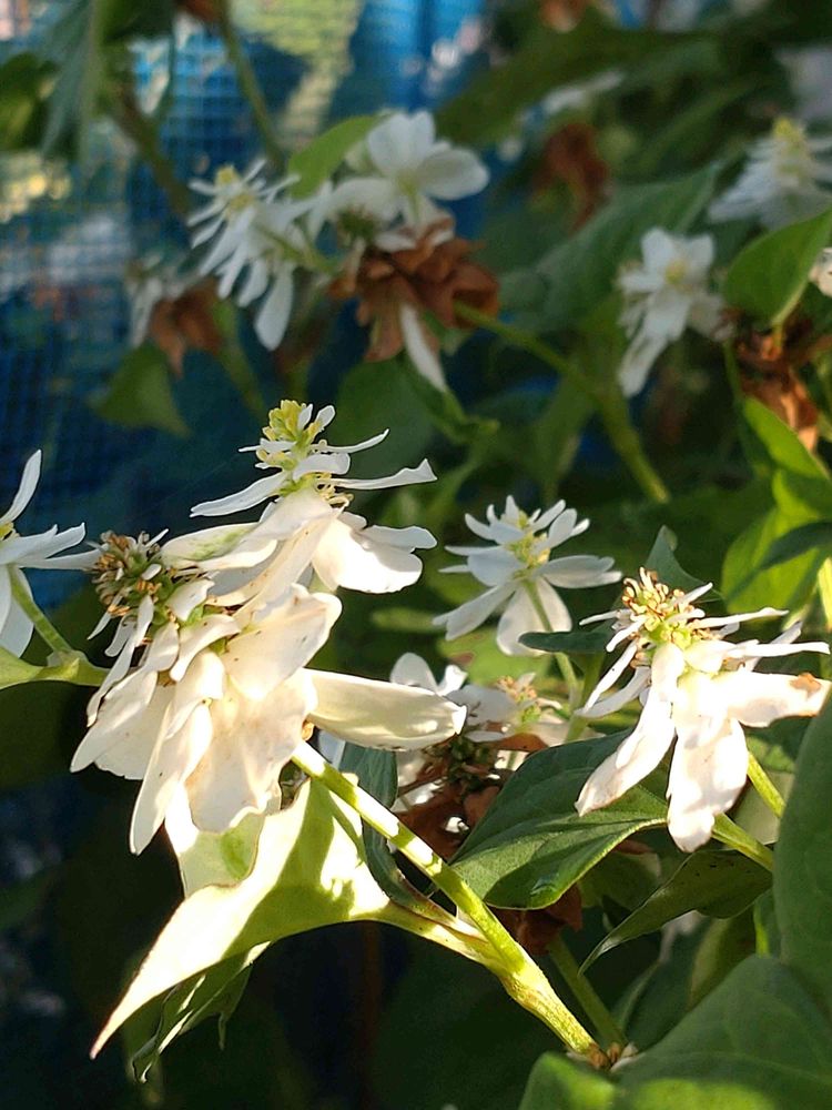 八重ドクダミもう咲き仕終いです花の下も茶色で花丈も伸びてきました今年は沢山咲きましたよ❣️