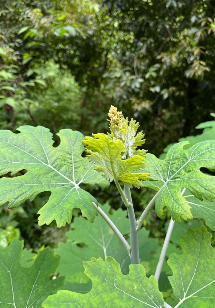 ⑤5月中旬、大きな葉っぱに蕾が!この時はどんな植物か認識しておらず、どんな花が咲くのだろうと開花を楽しみにしていました😊