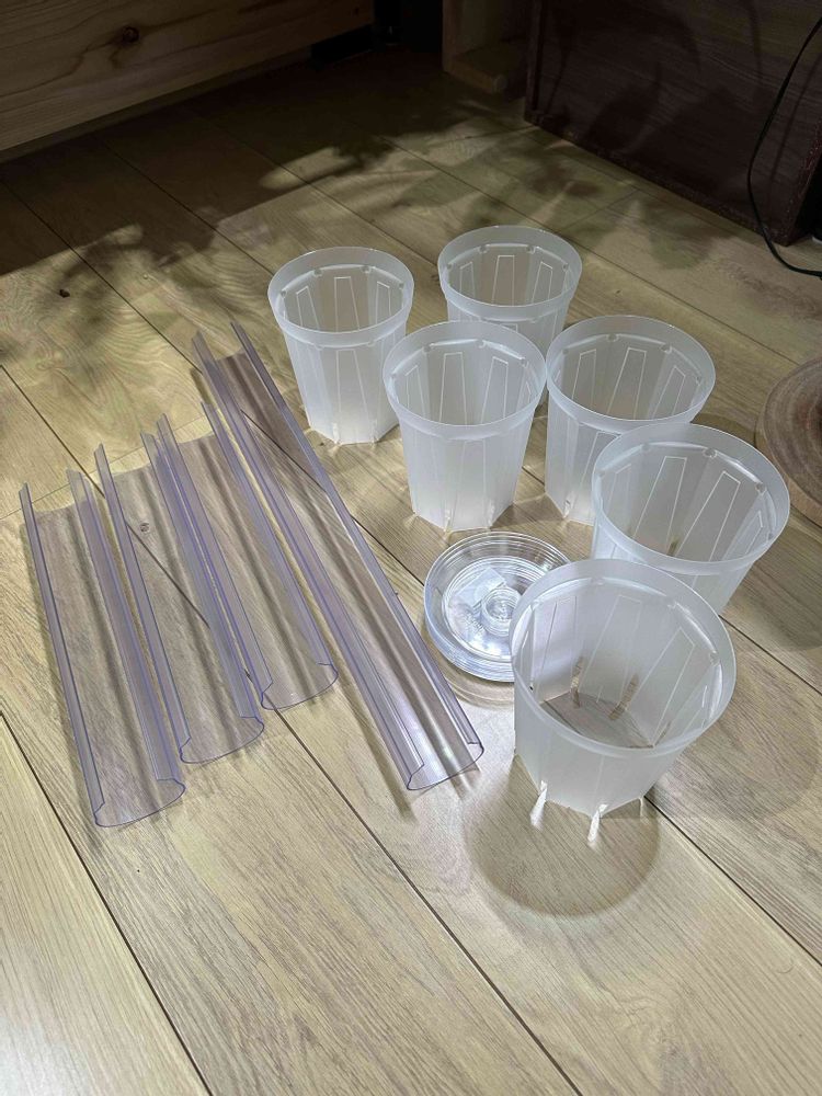 まとめて全部ネットでe~花屋さんです。 鉢は浅岡園芸さんの透明スリットネガミエル 登り棒はネコさん 受け皿はどこのかわからないです☺️