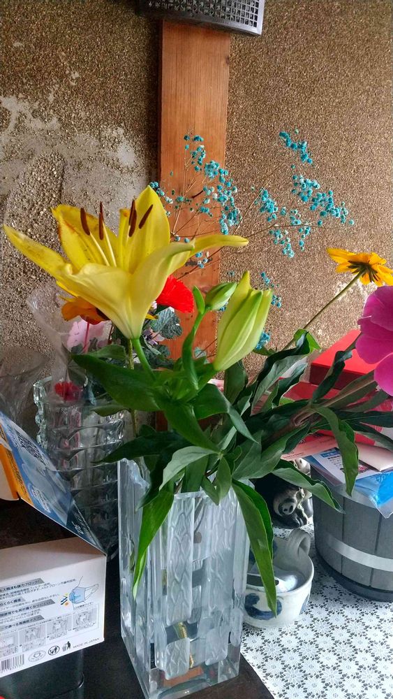 家の玄関の中に、黄色い百合の花が綺麗にたくさん咲いていました。