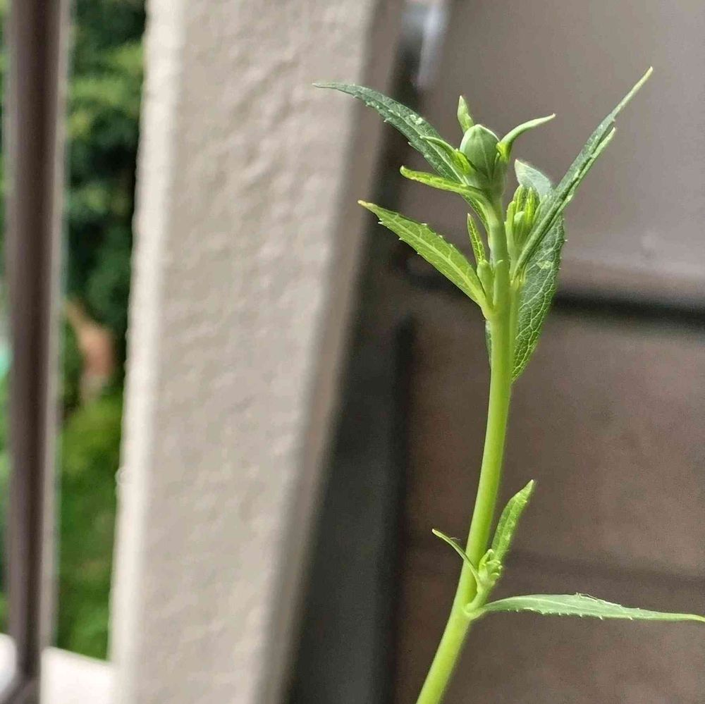 雨の日の朝、ひょろひょろの先に白い花が咲く予定です。