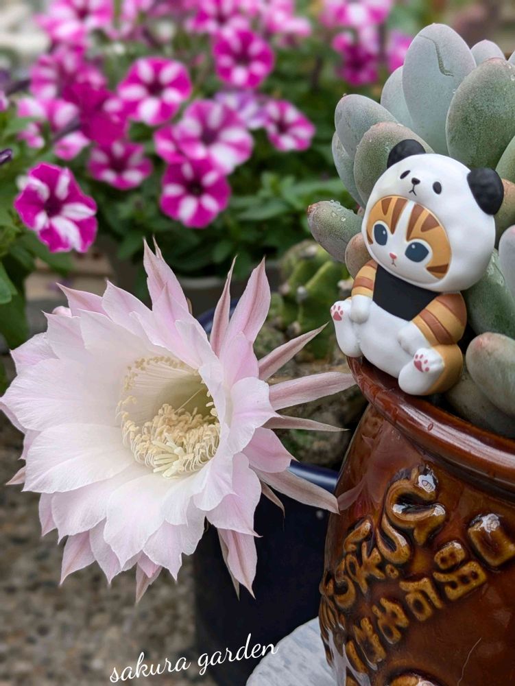 昨日 サボテン🌵の蕾が大きくなっていたので、カーポート下に避難しておいたら 咲いてました〜🤗💓 パンダ🐼ちゃんにも