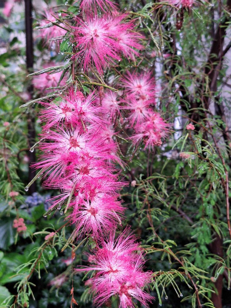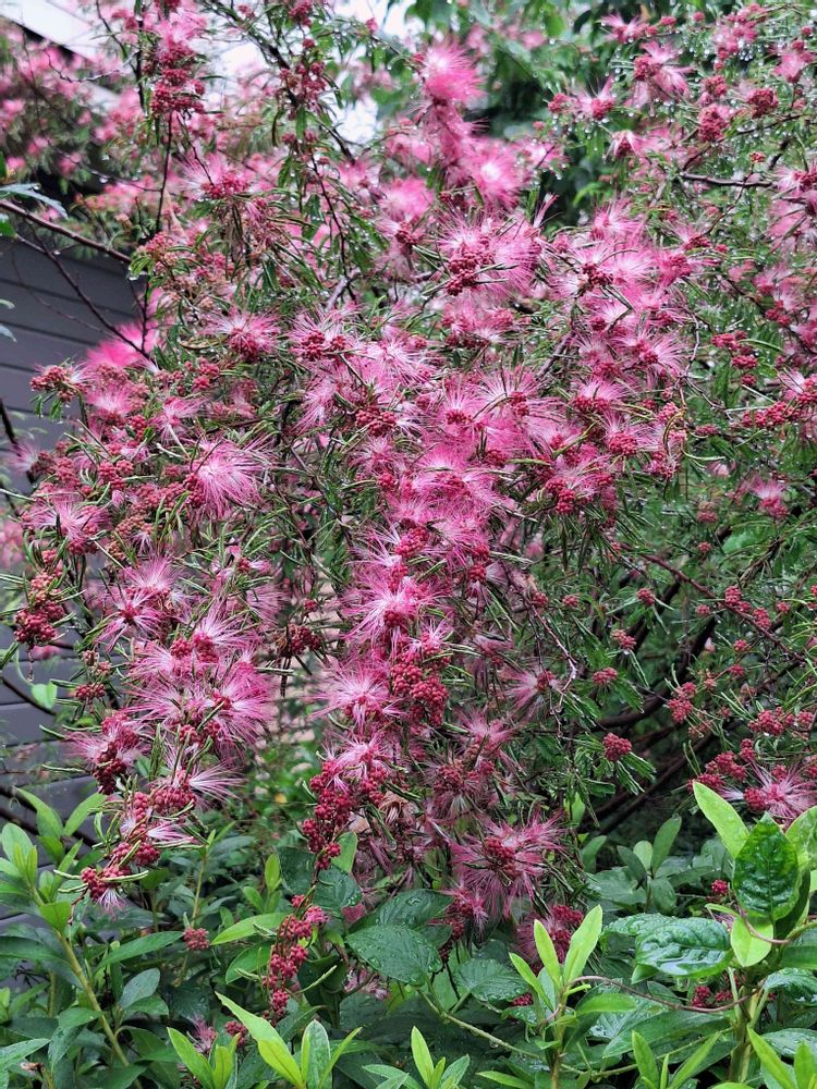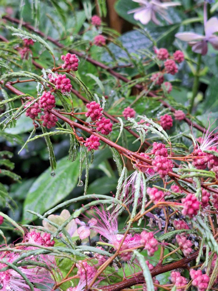 ①夕方近くになってネムの花が咲いて来ました。②蕾はちっちゃい○です。今日は☔なので🌿も閉じて。③花と蕾と半々位?④全体はこれですが、雨で少々残念な感じ。☀ならもうちょっとフワッと感が出るんですよ😅 ⑤今日のコンカドール。花が13個開きました☺️
