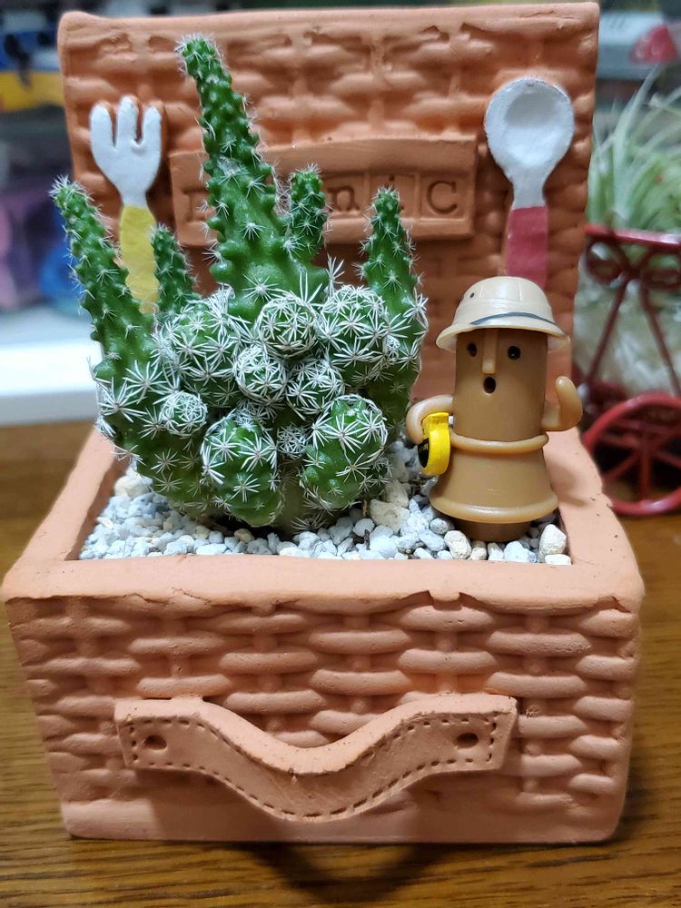 ハニワさんガチャで見付けたけど3cm位しかないのよ😆手にメジャー持ってます🤭 鉢が良いと100均のサボちゃんでも良く見えますね🤭
