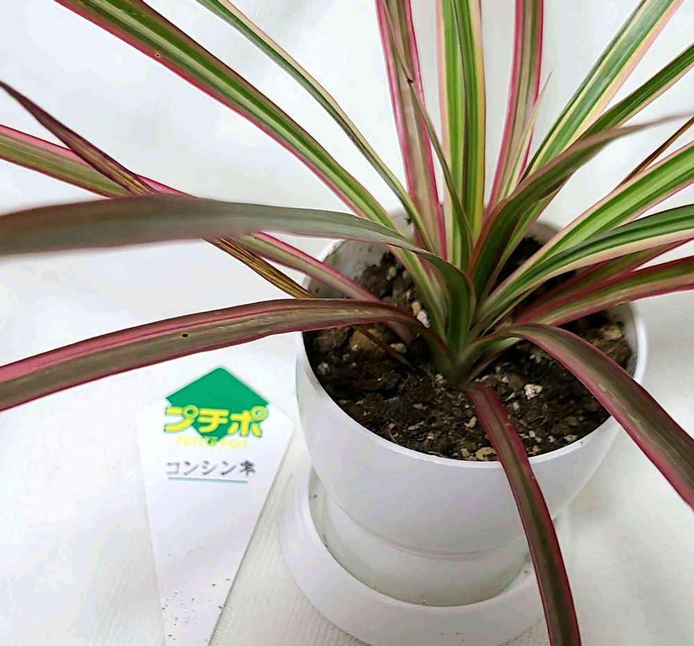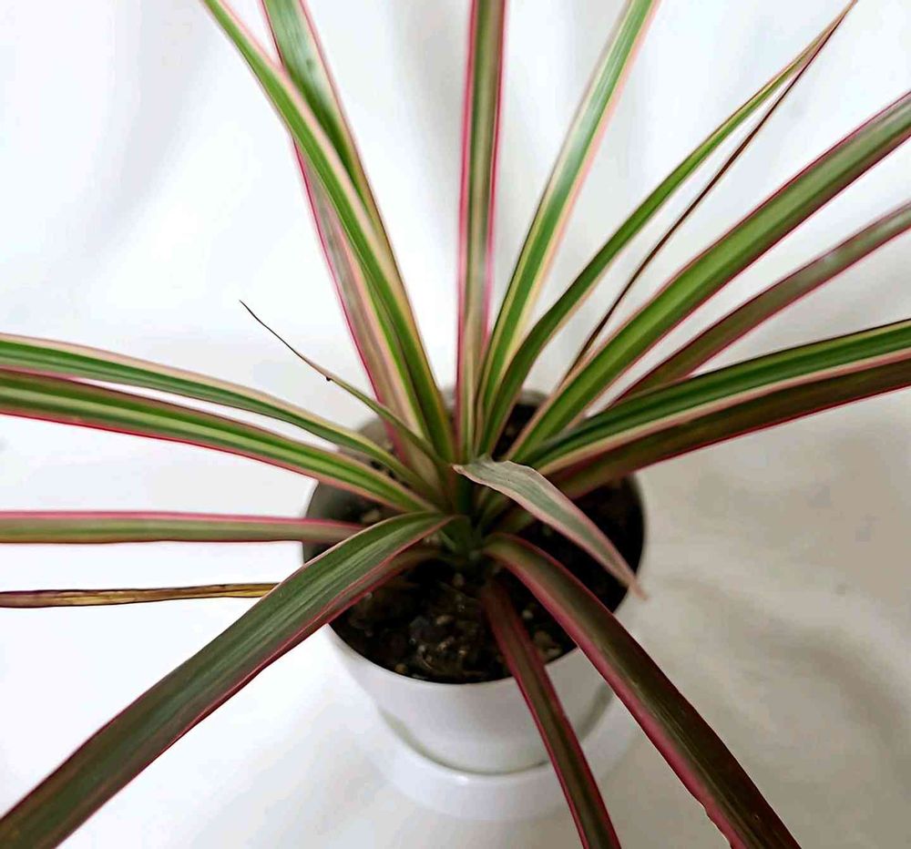 細い葉の緑に赤い斑入りが爽やかです。魔除けに良い観葉植物😊