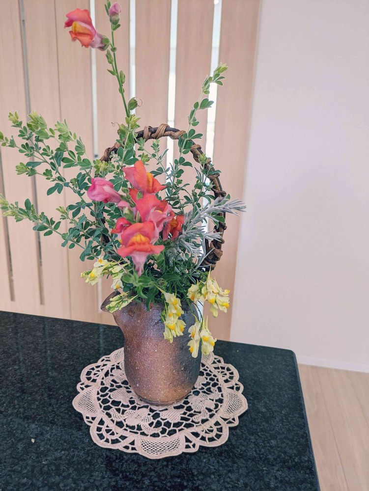 花器の🤎にキンギョソウの❤️や葉物の🟢🌿がよく映えて素敵です。💖