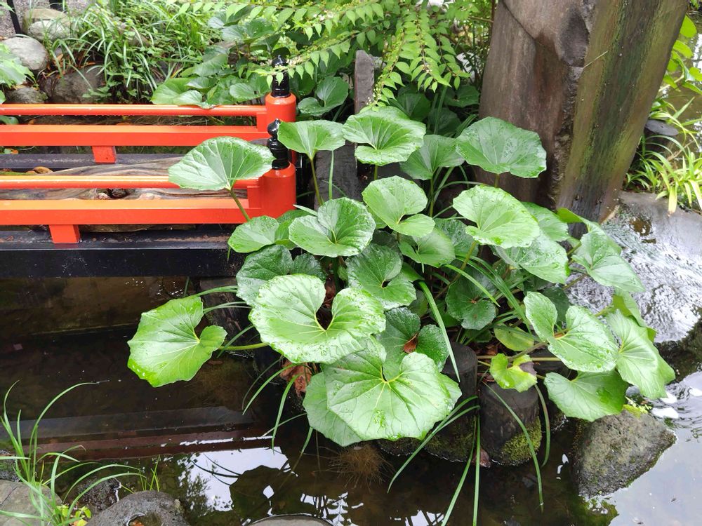 昨日の雨でツワブキの葉っぱも潤い朱塗のミニ橋によく似合います👏